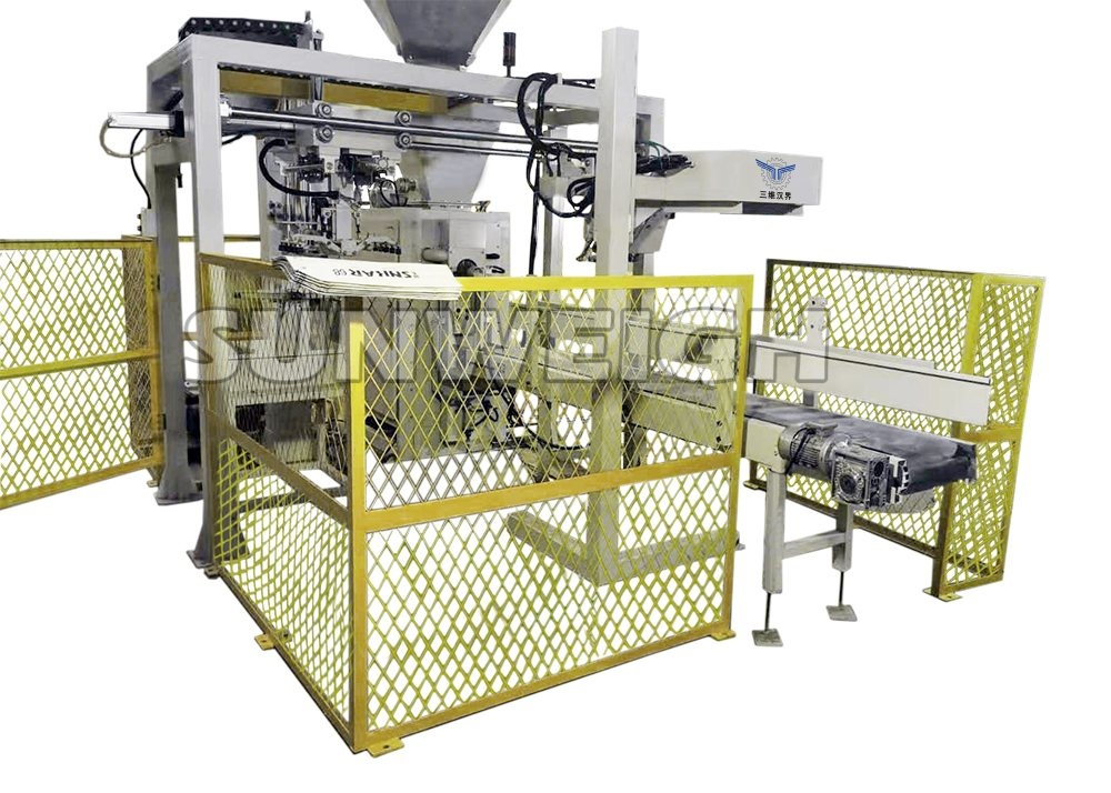 全自動閥口袋包裝機由自動袋庫、上袋機械手、封口裝置等部分組成,可自動完成閥口袋自動上袋、自動定量灌裝、自動移袋輸送、自動封口。整個運行過程只需人工將成摞包裝袋放置自動袋庫上,當檢測到袋庫內包裝袋即將用完時,自動報警提醒現場工作人員補充包裝袋。