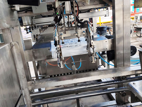 2.通過吸盤將包裝袋吸起,同時夾袋裝置將吸起的包裝袋移送到供袋整袋裝置,整袋裝置將包裝袋整袋調正。